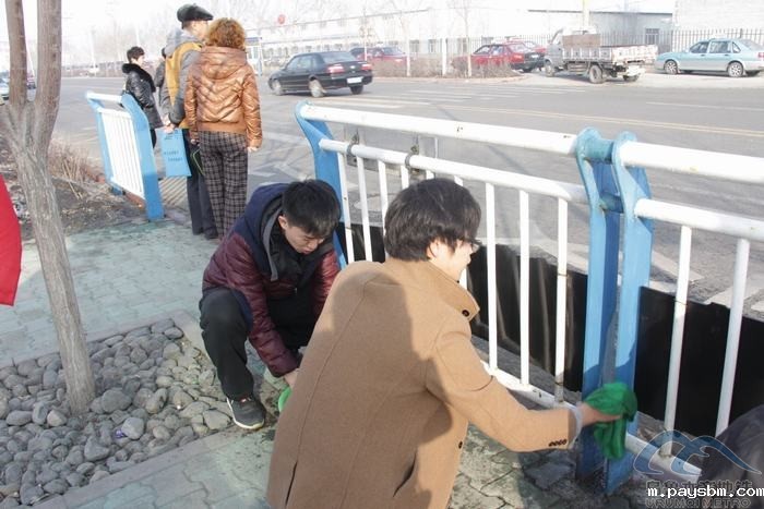 经过一个冬天的风雪和春季融雪后形成的泥水,车站附属构筑物表面一层污浊,“文明交通”和“讲文明树新风”的公益广告牌也不再鲜亮。志愿者们不怕脏不怕冷,细心擦洗车站护栏,不一会儿,污浊的栏杆在阳光下渐渐显现了“真身”。 过往车站的公交车辆也主动避让志愿者,周边候车的乘客纷纷投来赞许的目光。