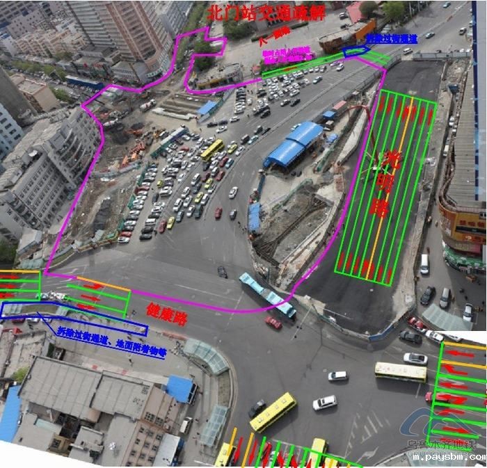 近期,北门站一期晨报大厦一侧盖挖施工区顺利完成管线改迁及盖挖作业施工,实现首期围挡区域拆除还路。轨道交通1号线北门站是沿解放北路呈南北向布置,车站长165.3m,宽21.3m,地下三层框架结构,12m岛式站台。该站位于解放北路、文艺路、光明路、新民路、青年路、健康路六条车道交汇处,人流、车流量大。按照市委、市政府的要求,为加快北门站施工进度,在市交警支队、交通运输局等单位的全力支持下,分别于2015年3月8日和2016年3月1日对北门站晨报大厦一侧及解放北路段、文艺路路口进行了全封闭施工。由于道路封闭后对该区域交通出行造成一定影响,市轨道办、城轨集团会同交警支队、交通局优化完善交通导改方案和公交车、BRT绕行方案,最大限度减少道路封闭对交通的影响,广大市民也对此表示了极大的理解和配合。