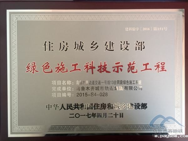 《乌鲁木齐轨道交通一号线13合同段绿色施工系统》课题为2014年城轨集团与轨道交通1号线13合同段中铁隆工程集团有限公司联合在住房城乡建设部申报的绿色施工科技示范工程,经过2年的研究,项目于2016年11月24日通过验收。住房和城乡建设部建筑节能与科技司委托中国土木工程学会总工程师工作委员会对课题进行了验收。验收委员会认为该项目已完成了绿色施工科技示范工程的相关工作和考核指标,项目施工管理可控、组织严密、最大限度地节约了资源,保护了环境和减少了污染,取得了“四节一环保”显著效果,同时也获得了较好的经济和社会效益,具有良好的示范作用及推广意义,同意通过验收。
