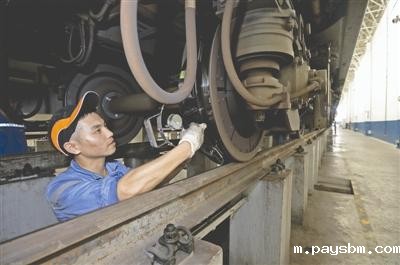 随后,李雪峰也钻进了列车底部,对已经检修的部件再次进行检查。1.73米的李雪峰只能弓着腰,小步穿梭在车底,额头上豆大的汗水也不断顺着脸颊流下。他告诉记者,这还不是车底最热的时候。“有时候列车刚刚回来就要进行紧急检查,车底的电阻制动箱、牵引电机都非常烫,表面温度高达80℃。车下作业的检修人员不仅要忍受高温,还必须非常谨慎,绝对不能触碰到这些部件。”