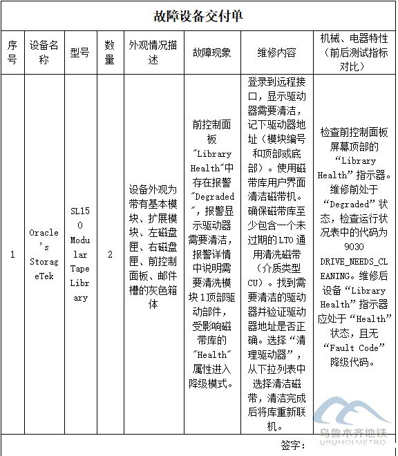 1.2项目概况:乌鲁木齐轨道交通1号线自动售检票系统磁盘阵列磁带库(SL150型,产自德国)设备厂家为Oracle。该设备是售检票系统磁盘阵列(组成部分),2023年12月4日AFC磁盘阵列磁带库进入降级运行模式,需对驱动器进行清洁,具体内容详见《用户需求书》。