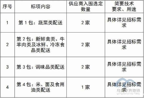 二、项目概况:本项目涉及食材物资配送共分为4个包号,即第1包:蔬菜类配送;第2包:新鲜禽类、牛羊肉类及冰鲜、冷冻食品类配送;第3包:调味品类配送;第4包:米、面及食用油类配送。